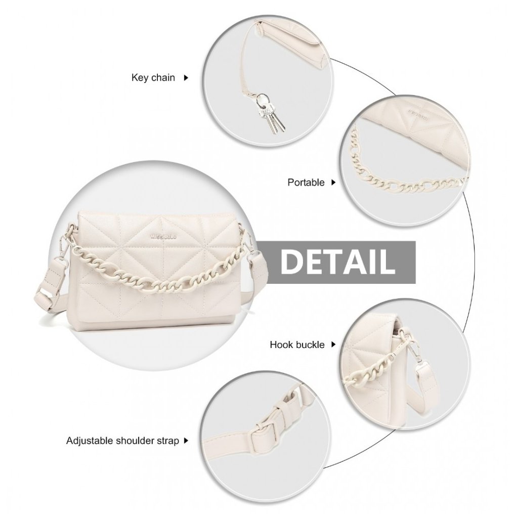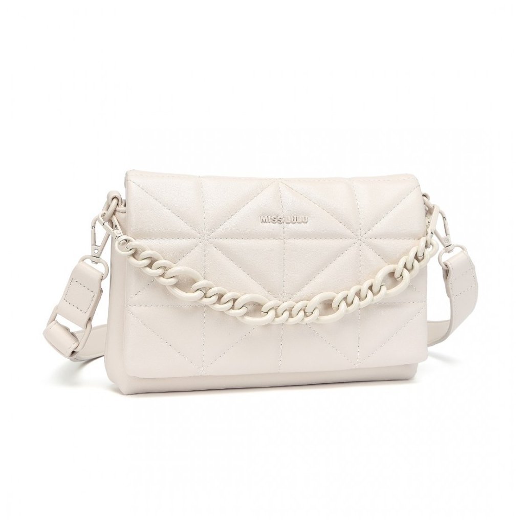 Atraktivní světle béžová kabelka typu crossbody s 3D prošíváním, dlouhým nastavitelným popruhem a efektním řetízkovým popruhem v barvě kabelky.