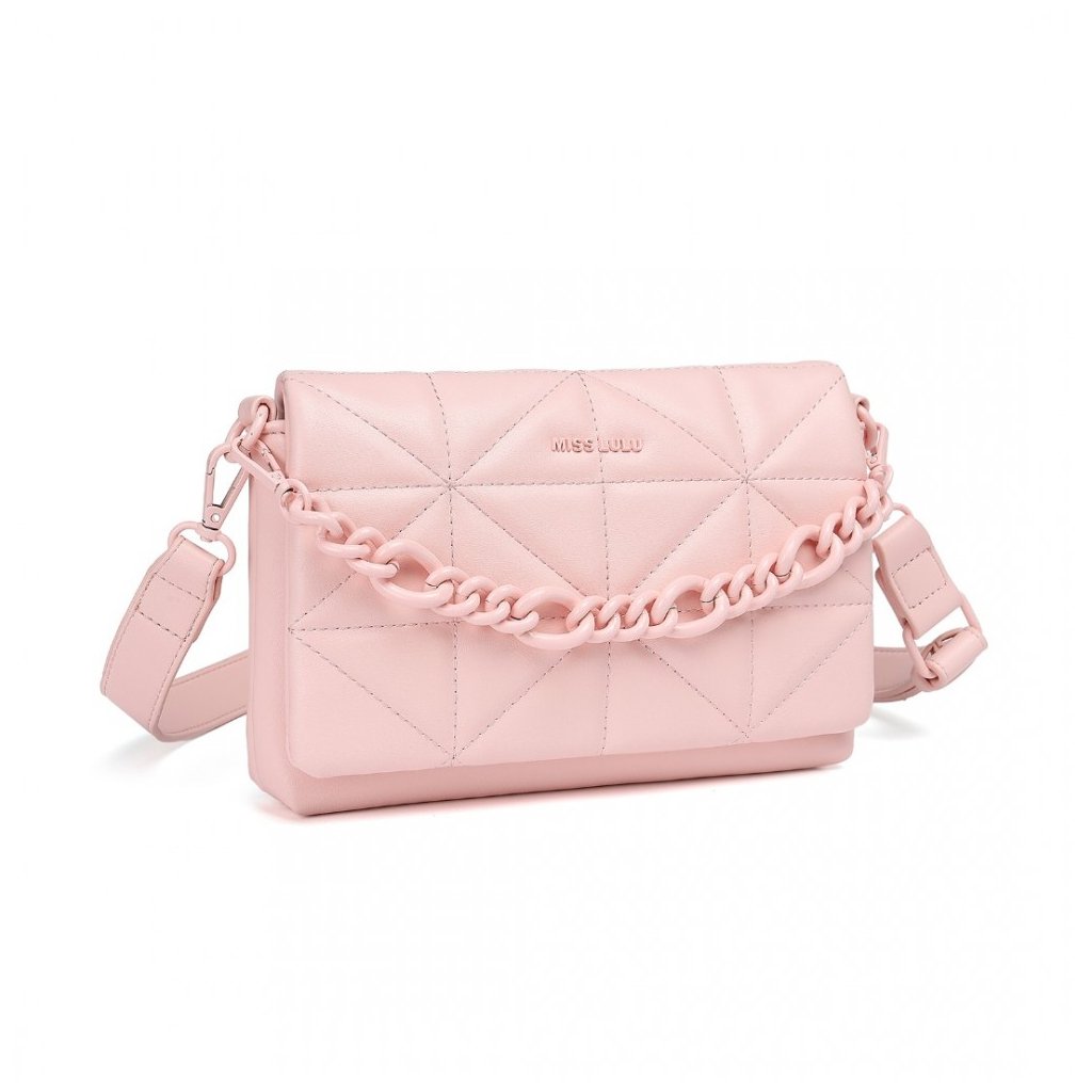Atraktivní světle růžová kabelka typu crossbody s 3D prošíváním, dlouhým nastavitelným popruhem a efektním řetízkovým popruhem v barvě kabelky.